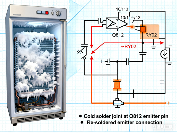 The emitter pin of Q812 was re-soldered to restore a proper connection. After reassembly, the defrost function operated normally, and the fault was resolved.